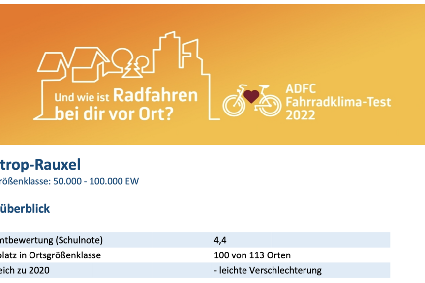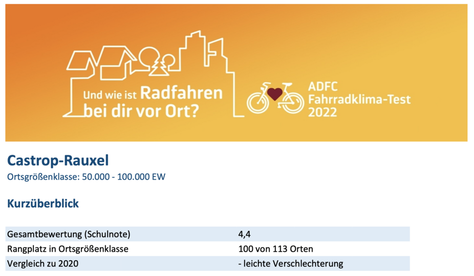 Leider konnte sich die Stadt Castrop-Rauxel auch im Fahrradklima-Test aus dem Jahr 2022 nicht verbessern. Im Gegenteil, das Ergebnis hat sich sogar verschlechtert. Damit fällt C-R auf Rangplatz 100 von 113 Städten (In Ortsgrößenklasse 50.000-100.000 Einwohner). Das zeigen die Ergebnisse des Tests, die jetzt veröffentlich wurden.
